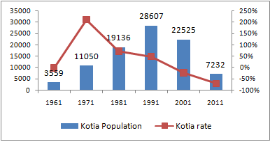 Also known as Kotia Paika they are one of the endogamous section of Paika community who are known for their past history of military service under the then kings and feudal chiefs of south Odisha. They are a small hill tribe inhabiting Odisha and Andhra border area. The community is divided into two endogamous groups i.e. Bodo Kotia and Sano Kotia, which are further divided into a number of totemistic exogamous clans (Vansa) like Khara (Sun), Naga- Onthalu (Cobra), Goripitta (a bird), Killo / Pulli (tiger), Macha (fish), Bhall (bear), Khilo, Hanu (monkey), Khinbudi, Sukri and Pangi (a kite) etc. Kotia family is nuclear, patrilocal, patrilineal and patriarchal. Monogamy is common norm and the custom of bride price is prevalent. Marriage through negotiation is regarded as ideal. Cross cousin marriage and marriage by elopement and by service, junior levirate, junior sororate, remarriage of widow, widower and divorcees are allowed in their society. Inheritance of paternal property follows the rule of male equigeniture. They observe puberty rite for adolescent girls (Kanya uthani). Kotia have their own traditional community council headed by Nayak who is assisted by their sacred specialist Dissari, Pujari, Guru and their messenger the Barik / Chalan. Their most important deity is Mauli Debta, whose shrine lies under a kendu tree in their village. Nisaniguda is their goddess who protects them from smallpox. Both deities are worshipped in the month of Chaitra (March-April).